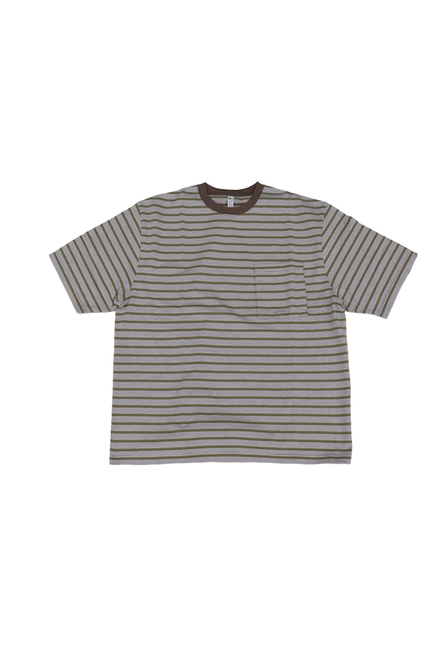 オリジナル生地のボーダー+ジャガードのTee ベースのカットソーを編み立てた上からを縦線部分をジャガードで加工している 凹凸あるオリジナル生地。ポケットはダブルポケット タンブラーをかける事で偶然生まれるカットソーとジャガードの縮率差による不均一な凹凸が特徴。 生地の肉感は40/2で24G(ハイゲージ)のジャガード編み MADE IN JAPAN. ※製品洗い+タンブラー乾燥による多少の寸法さはあらかじめご了承下さい。 size 着丈 身幅 肩幅 袖丈 M 68 57 50 26 L 71 60 51 27 XL 73 62 52 28