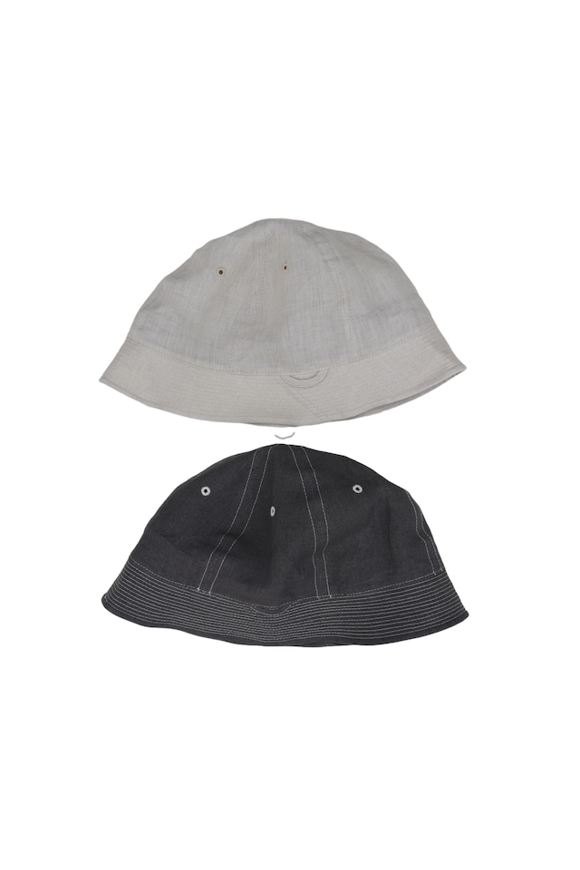 麻 100% MADE IN JAPAN 硫化染の日本製麻100%生地を使用した定番 DETOURS HAT。 両サイドにはネックストラップ用のループが付きます。 (ストラップは付属しません) スベリに使用した素材には接触冷感機能、吸水速乾性が備わっています。 縫製後水を通しています。 size one size(59cm)