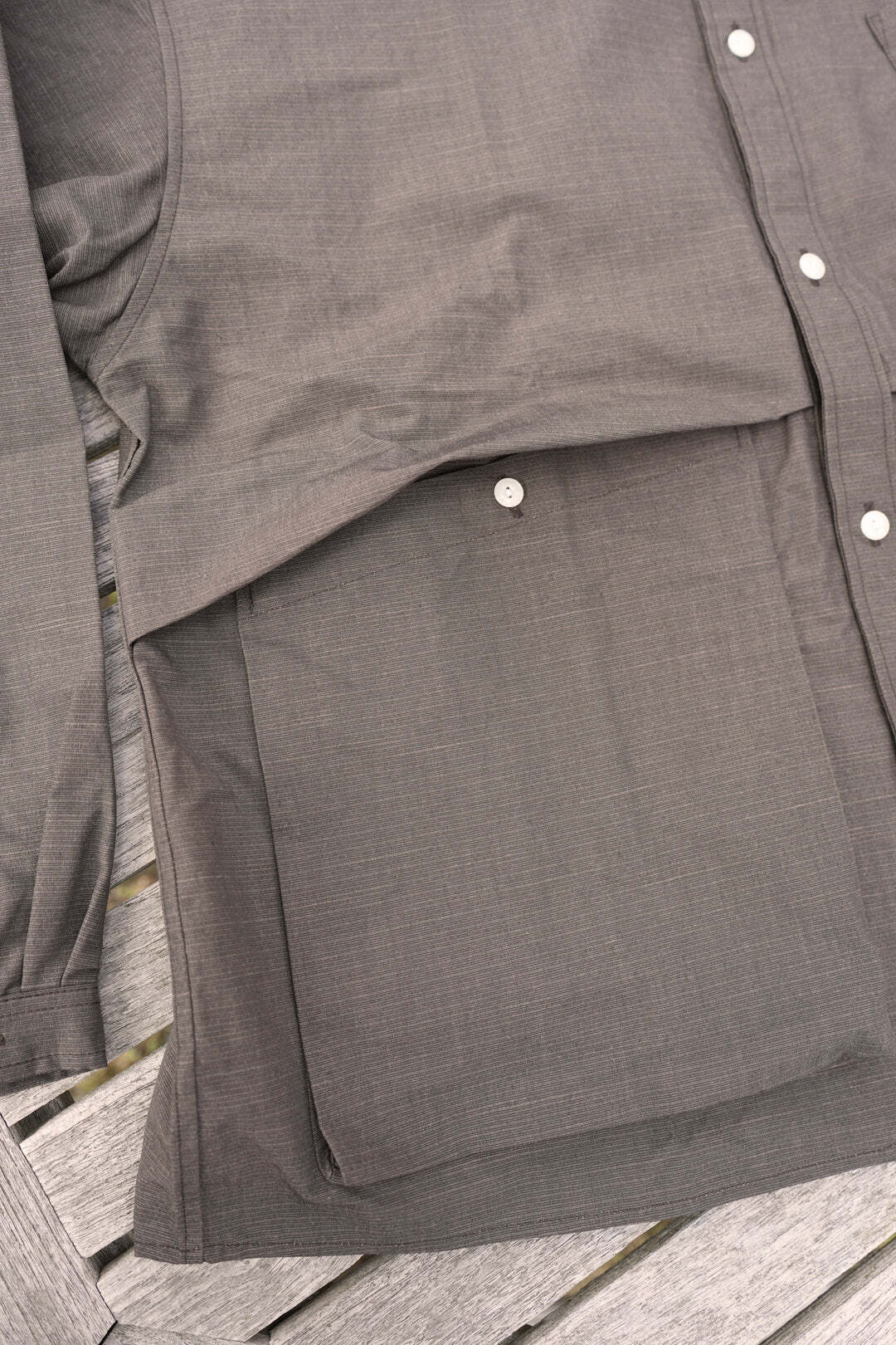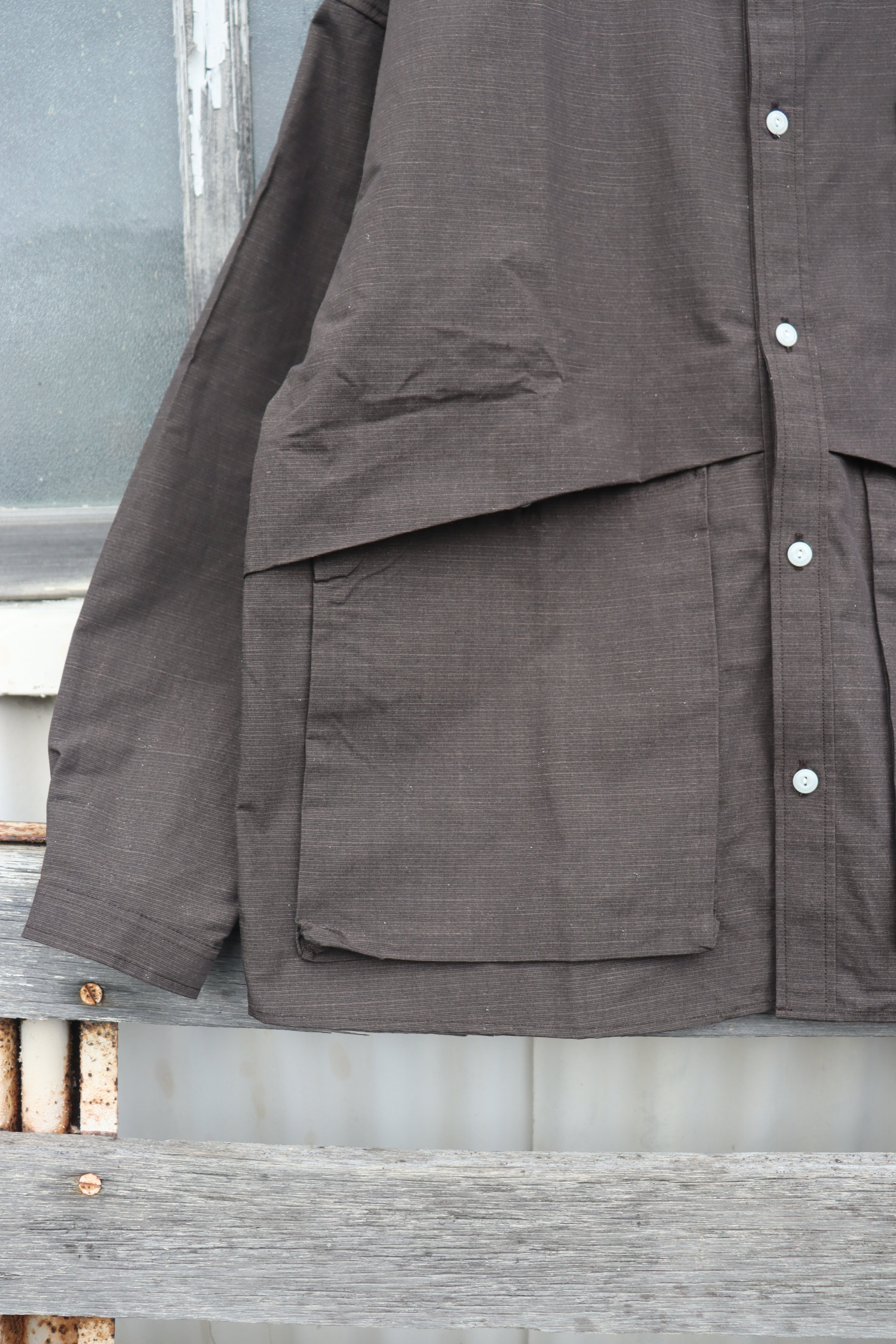 NORMAL SHIRTのパターンを残しつつポケットの仕様を大幅に変更したシャツ、一重のジャケットにようにも着用いただけるかと。